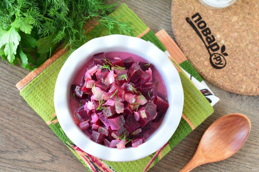 Свекла в сливках готова, блюдо стало более ароматным и сытным.