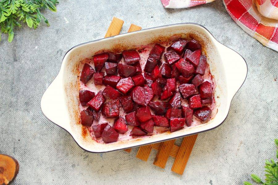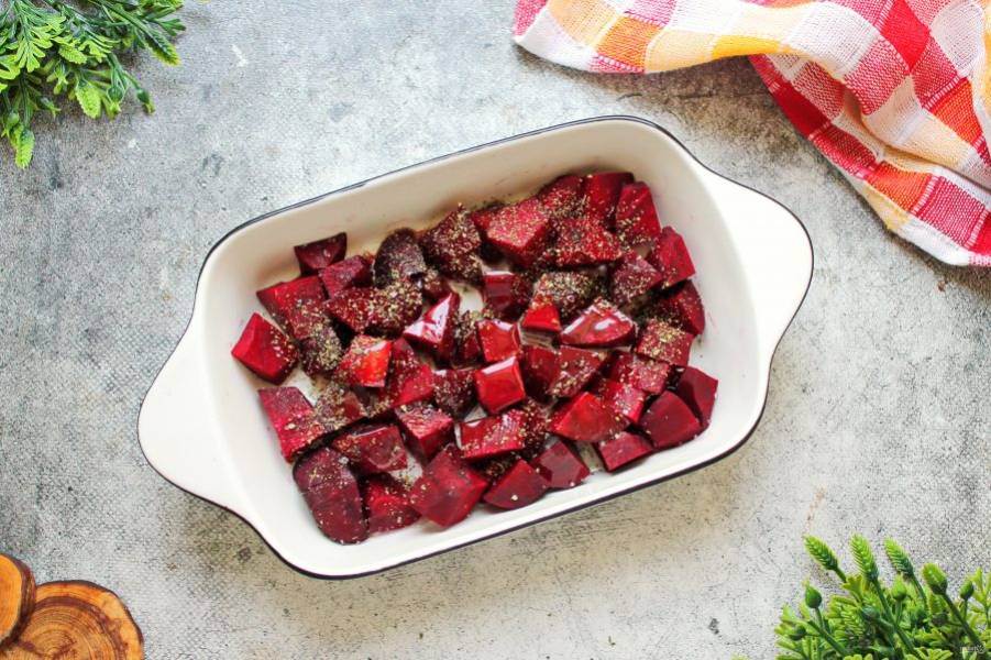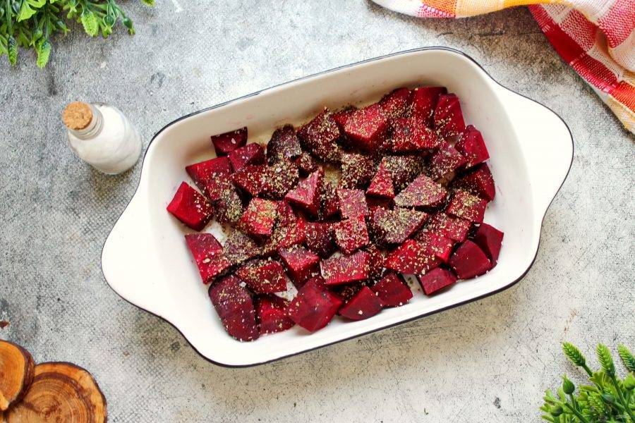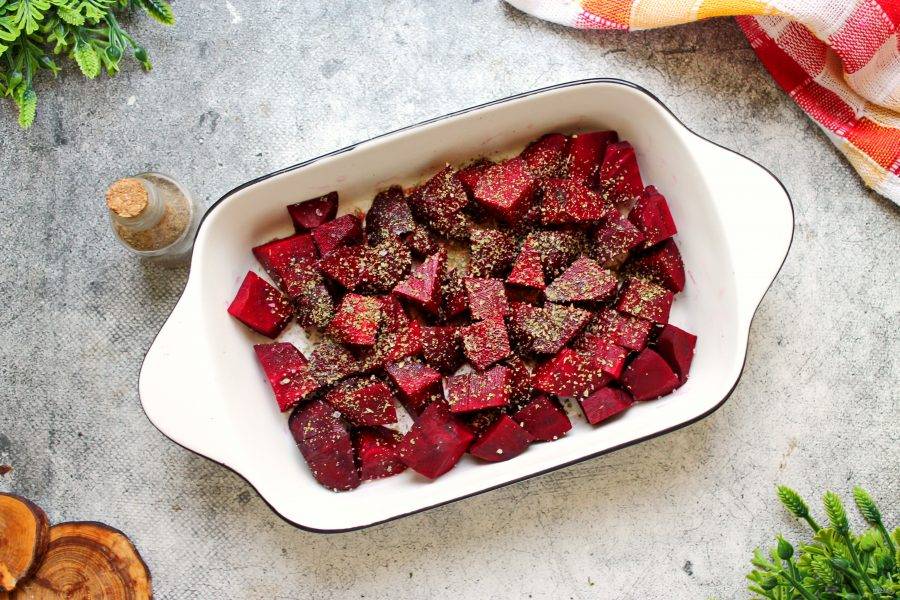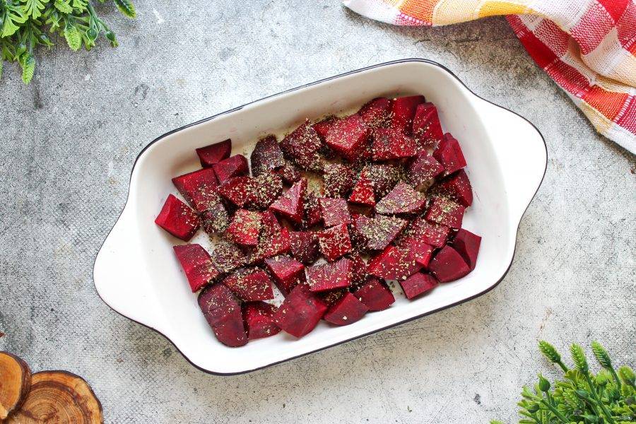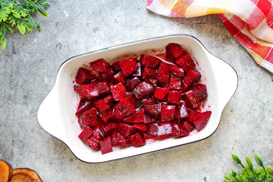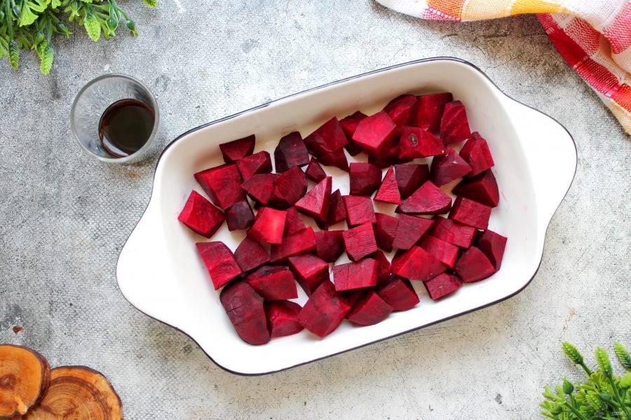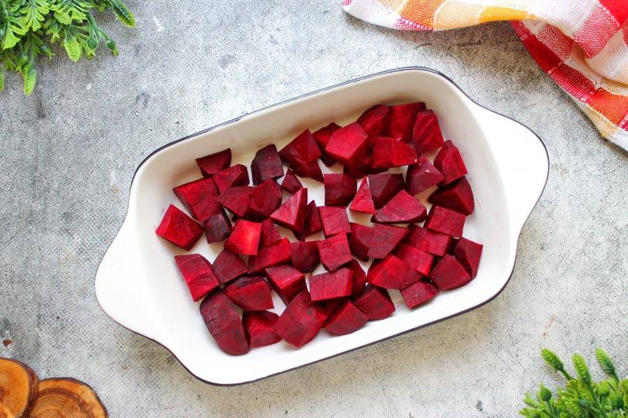 Свеклу порежьте средним кубиком и выложите в форму для запекания.