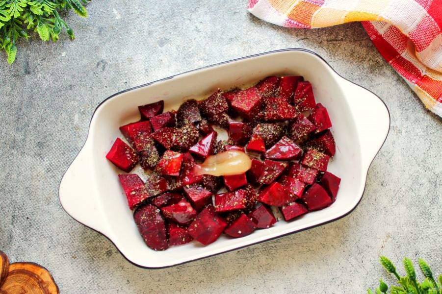 Все хорошо перемешайте, чтобы специи, масло и мед равномерно распределились по свекле.