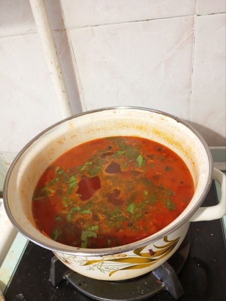 Даем закипеть, добавим лавровый лист и пробуем свекольник. Добавляем по вкусу соль, если это необходимо. Варим еще минут 5.