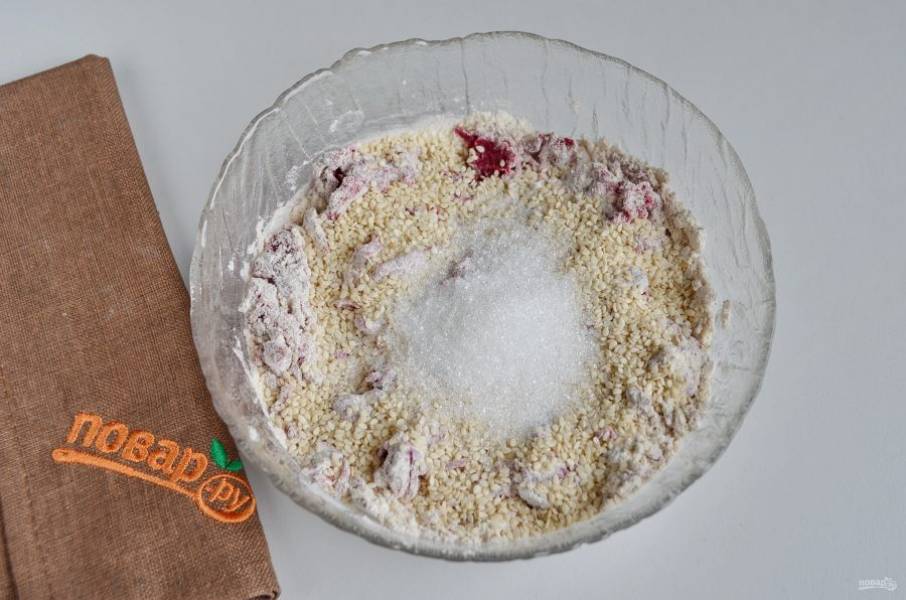 Всыпьте кунжут, сахар (или коричневый сахар), добавьте ванильный экстракт или эссенцию. Перемешайте. Кунжут я предварительно не жарю, потому как в духовке он пройдет эту процедуру и даст отличный аромат и вкус.