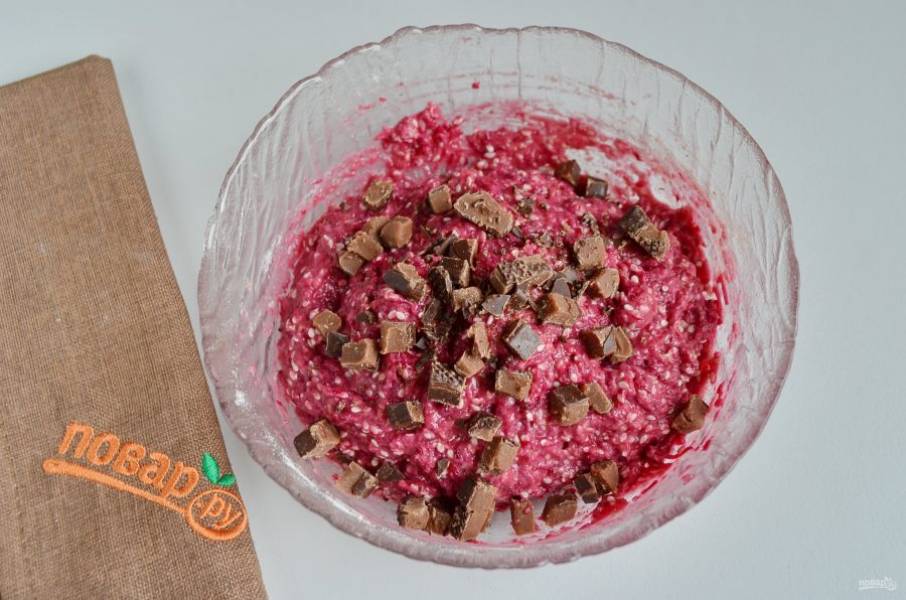 Конфеты порежьте мелко и добавьте в свекольное тесто. Перемешайте. Духовочку прогрейте до 180 градусов.