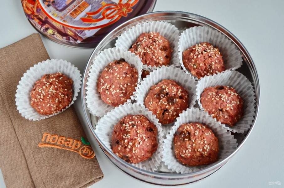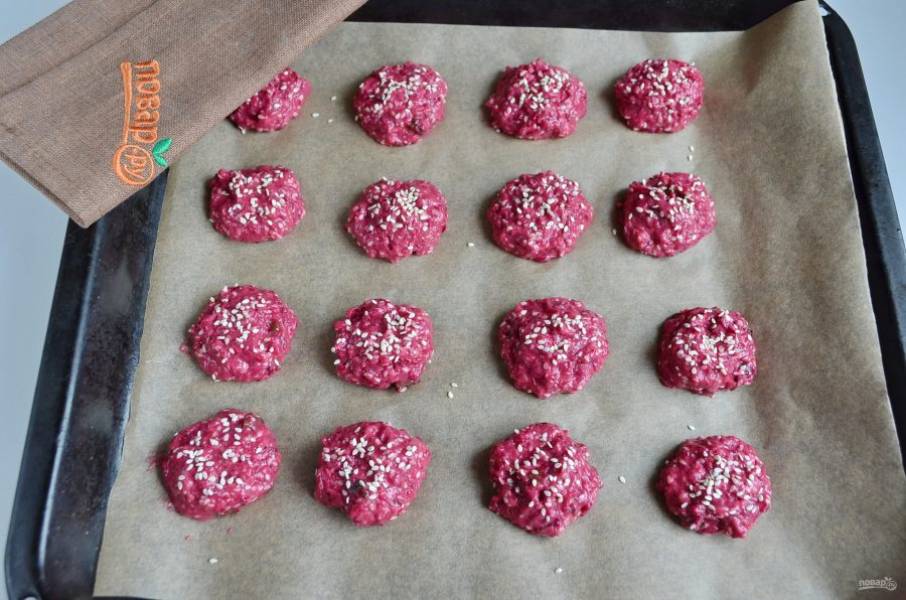 С помощью двух чайных ложек на пергамент отсадите тесто. Сверху посыпьте кунжутом. Отправьте в духовку на 15 минут. Если любите печенье более зажаристое и темное - то на 20 минут.