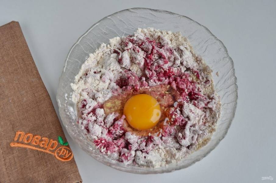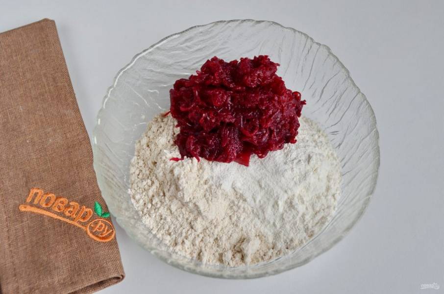 Смешайте два вида муки, добавьте разрыхлитель и свеклу. Перемешайте.