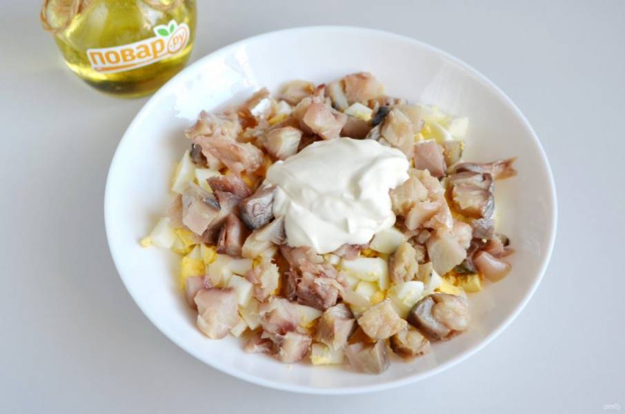 9. Для начинки вареные яйца порубите ножом. Рыбку разделайте на филе, порежьте кубиками. Соедините яйца с рыбой и сметаной.