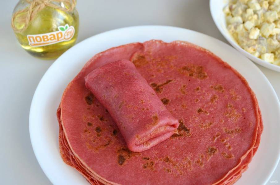 И не просто свекольные блины, а тонкие блинчики с вкусной начинкой! Внутри рыба копченая, вареные яйца и сметана - очень вкусно! Загляните в рецепт, узнайте, как приготовить свекольные блины!