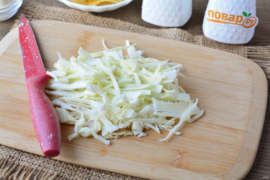 Всыпьте капусту в миску, туда же натрите на терке сырую морковку.