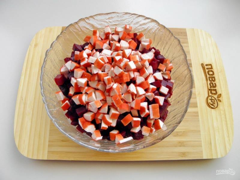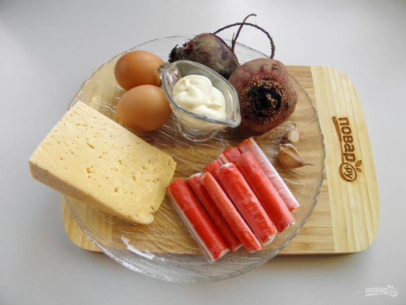 Подготовьте продукты для салата. Отварите или запеките в духовке свеклу. Остудите, снимите кожуру. Отварите яйца вкрутую, очистите. С крабовых палочек снимите обертки.