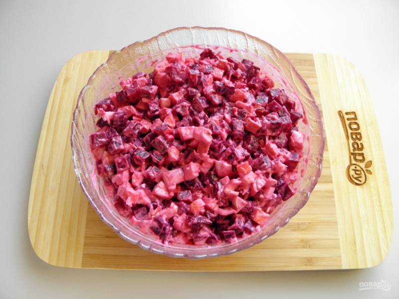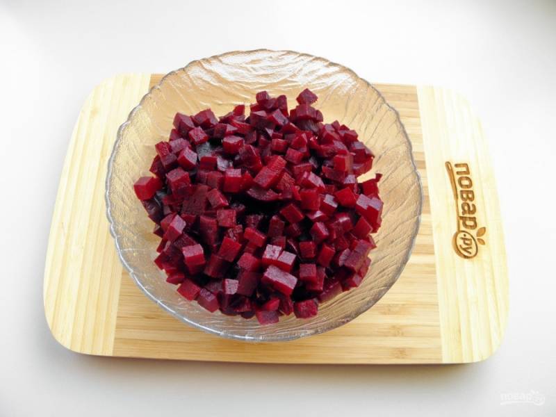 Очищенную свеклу порежьте небольшими кубиками. Сложите в салатник.