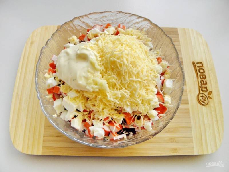 Сыр натрите на терке, можно использовать мелку или крупную, как нравится. Добавьте чеснок, пропущенный через пресс. Заправьте салат майонезом или соусом майонезным.