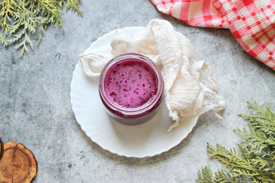 Массу процедите через марлю, сложенную в несколько слоев. Накройте банку сверху марлей и уберите в темное место на 30 дней. Готовый уксус профильтруйте, разлейте по бутылкам и уберите на хранение.