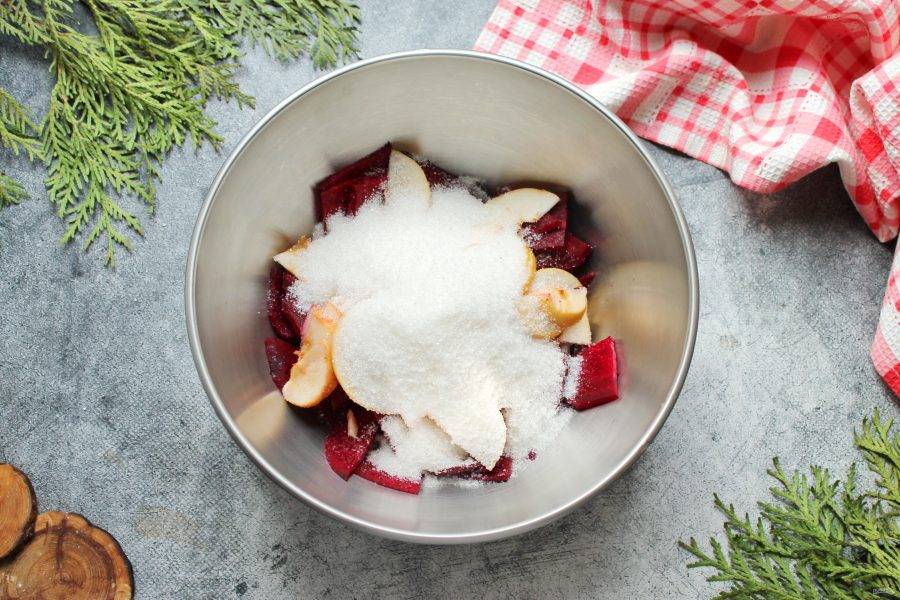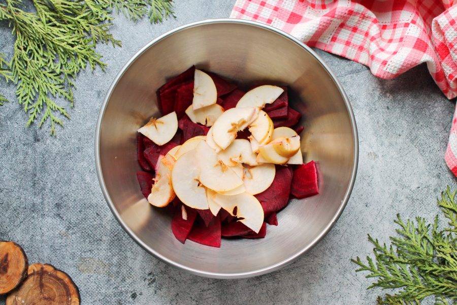 Яблоко разрежьте пополам и тонко нарежьте вместе с сердцевиной. Выложите яблоки в миску со свеклой.