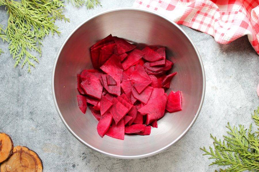 Свеклу очистите от кожуры, сполосните и порежьте тонкими ломтиками.