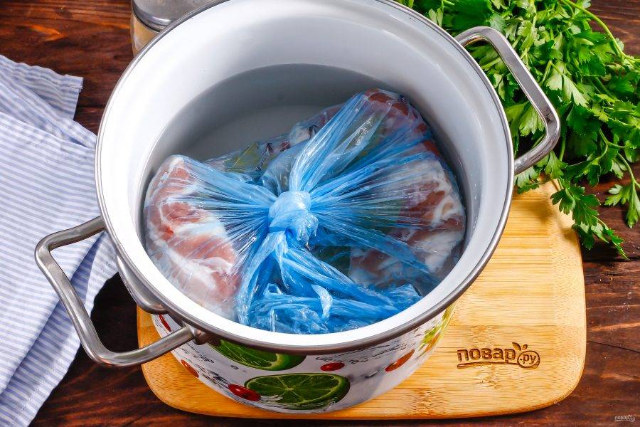 Поместите мясо в пакете в кастрюлю и залейте горячей водой. Емкость поместите на плиту и отварите в течение 50 минут.