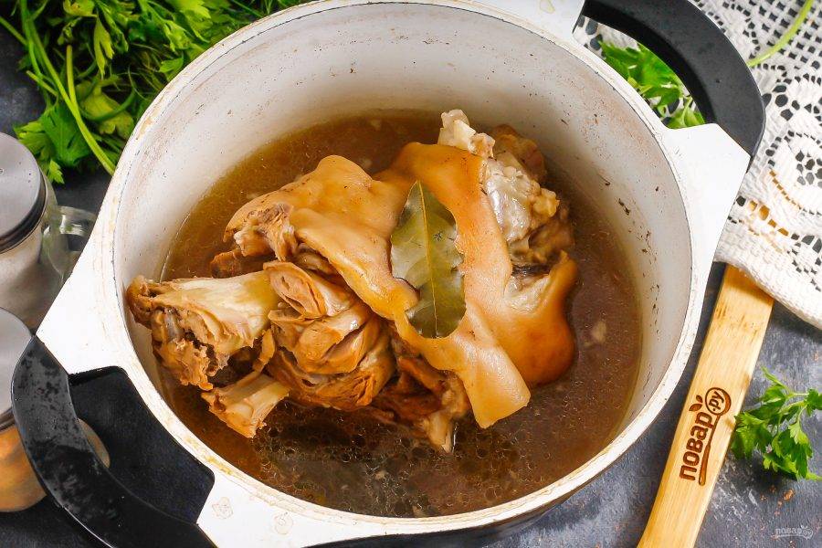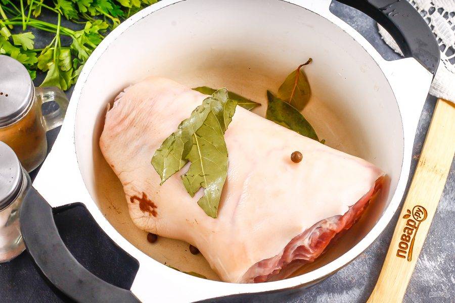 Выложите ее в казан или кастрюлю с антипригарным дном. Добавьте лавровые листья, горошины черного перца и другие пряности по своему вкусу.
