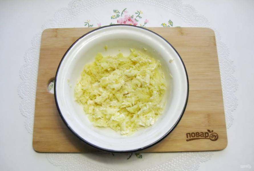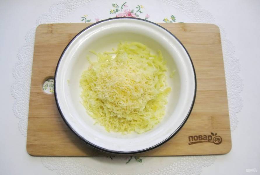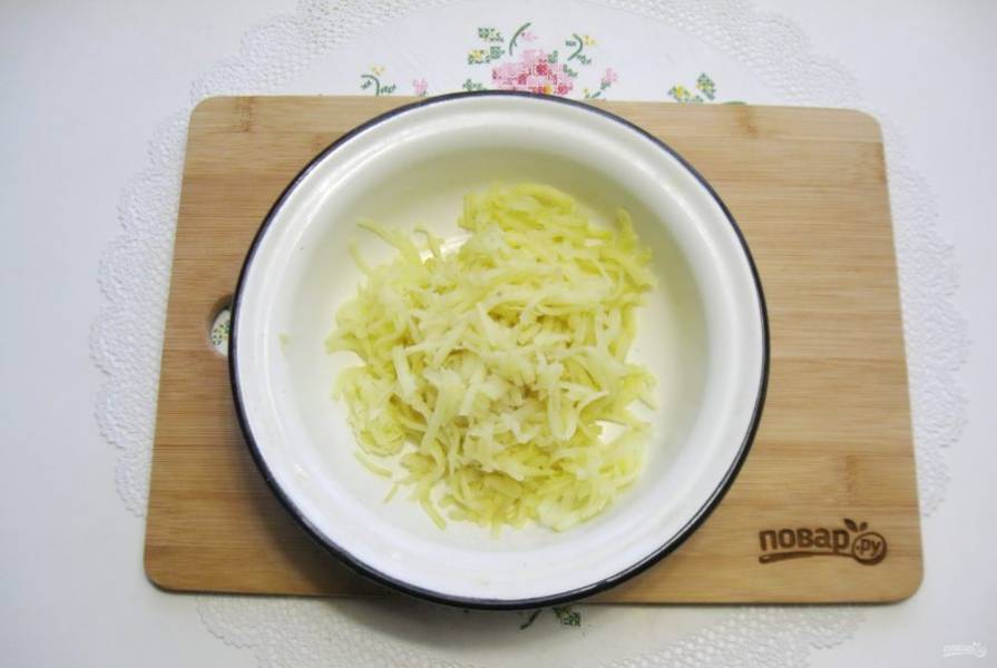 Картофель сварите в "мундире". Полностью охладите, очистите и натрите на терке.