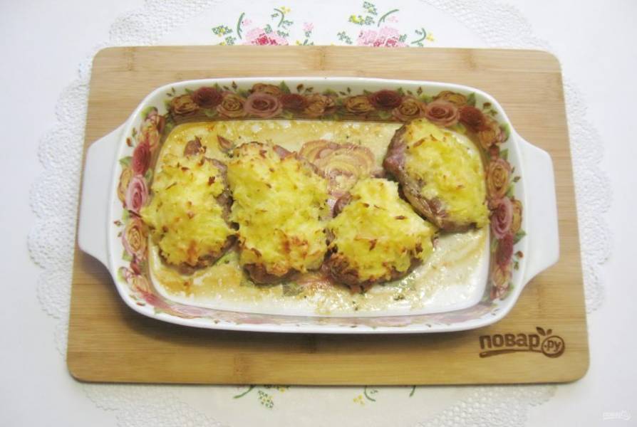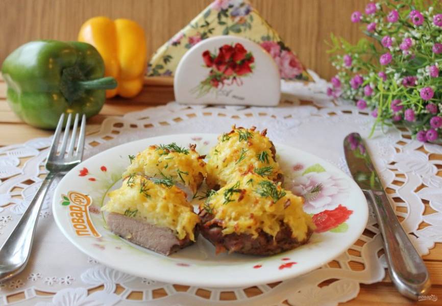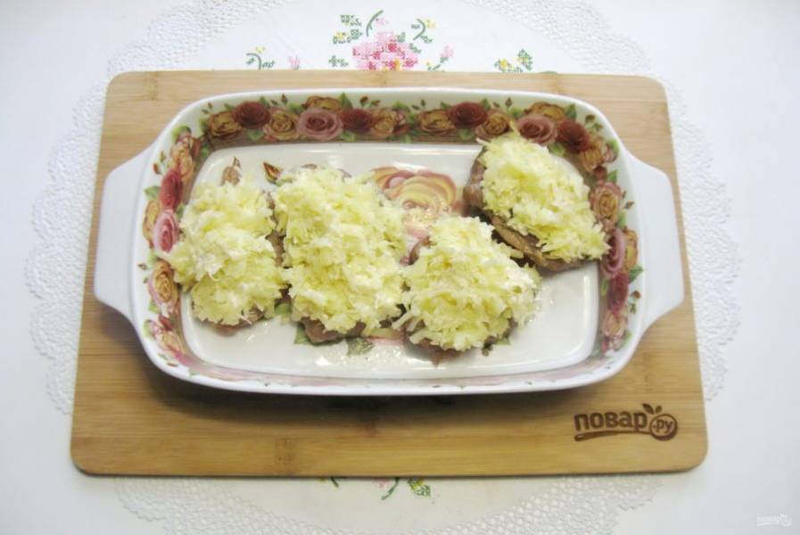 На каждый кусочек мяса выложите смесь картофеля, сыра и сметаны.