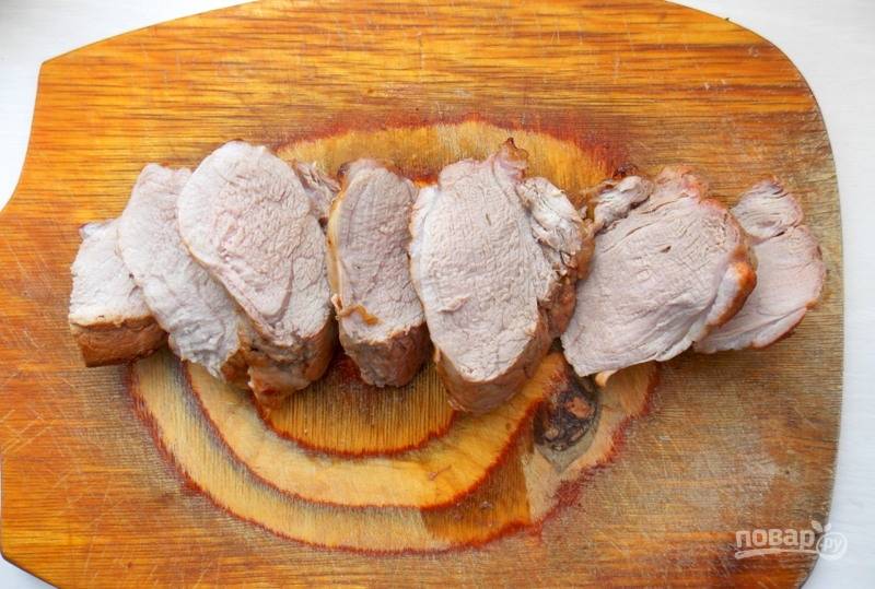 Готовую вырезку выньте из духовки и накройте фольгой. Оставьте на 10 минут, чтобы мясо созрело. Порежьте на кусочки.