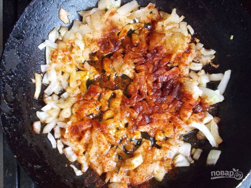 Добавьте молотую паприку, перемешайте и обжаривайте еще 2 минуты.