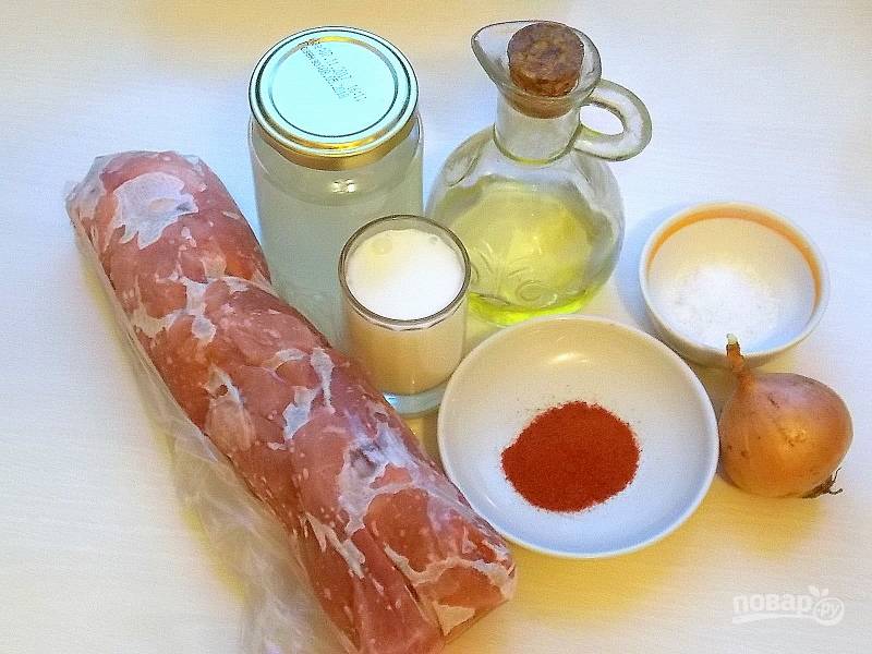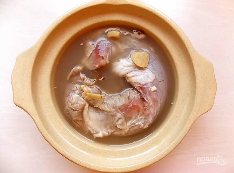 Свиную вырезку залейте рассолом и оставьте мариноваться на 12 часов.