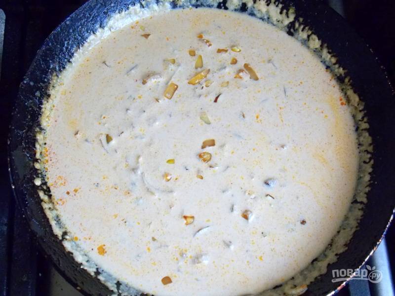 Влейте сливки, доведите до кипения и варите 2-3 минуты.