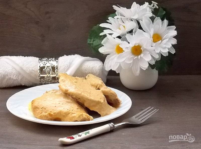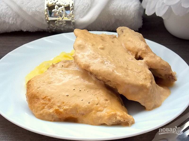 Переложите мясо в сковородку и залейте соусом, доведите до кипения и оставьте под крышкой на 10-15 минут.