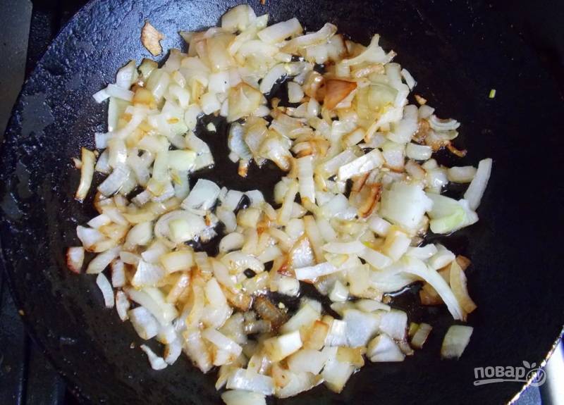 Почистите лук, порежьте и обжарьте на этой же сковородке 3-4 минуты.