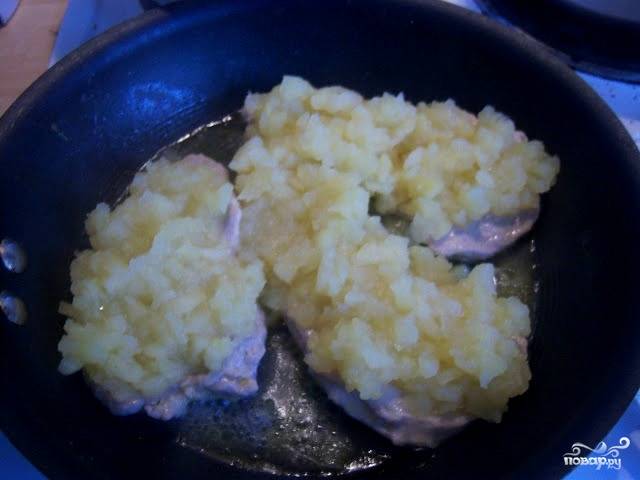 Затем переворачиваем на другую сторону, а на обжаренную сторону выкладываем приготовленный соус. Накрываем кастрюльку крышкой и тушим свинину на медленном огне 25-30 минут. Готовое блюдо принято подавать с картофельным пюре и отваренными овощами. Приятного вам аппетита!
