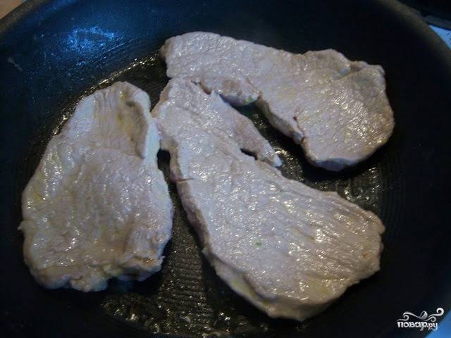 В сковороде разогреваем рапсовое масло и выкладываем на нее куски свинины. Жарим на среднем огне по 3 минуты с одной стороны.