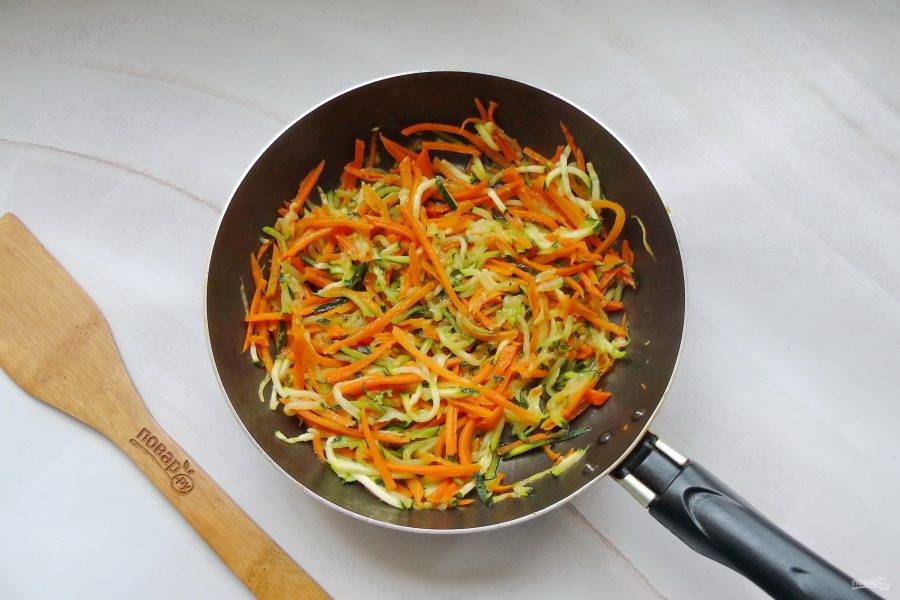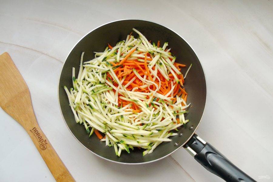 Тем временем займитесь овощами. Морковь очистите и помойте. Цуккини помойте, можно не чистить. Нарежьте овощи с помощью терки для корейской моркови или ножом соломкой. Выложите в сковороду, налейте немного растительного масла.