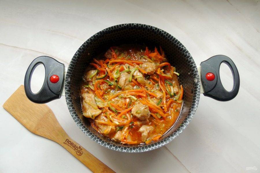 После выложите овощи в кастрюлю с мясом, налейте 150 мл. воды, добавьте соль, сахар, перец черный молотый. Тушите до готовности.