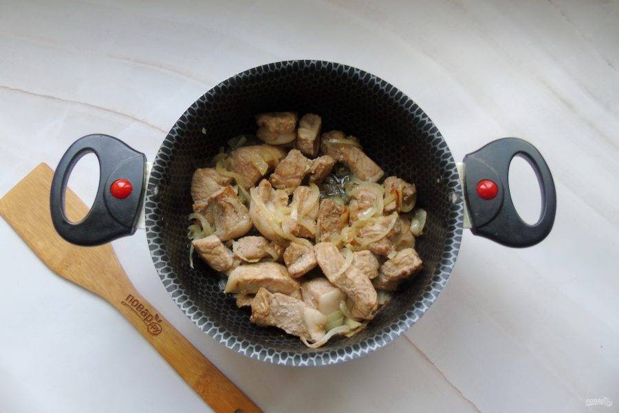 Репчатый лук очистите, помойте и нарежьте полукольцами. Добавьте к мясу, налейте растительное масло и обжаривайте 15-20 минут, периодически перемешивая.