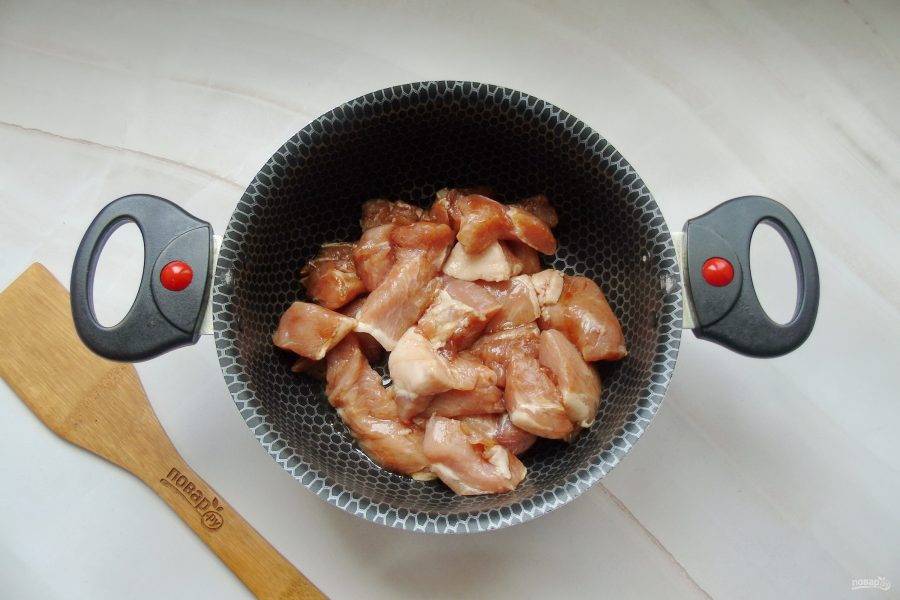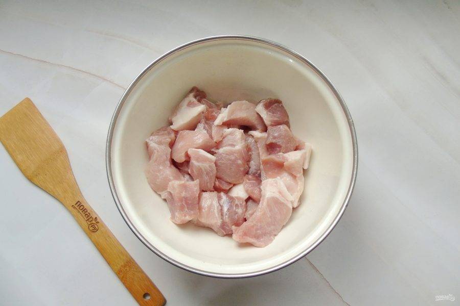 Свинину помойте и нарежьте небольшими кусочками. Выложите в миску.