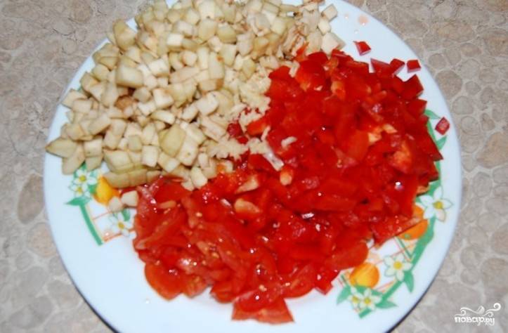 Пока мясо маринуется, мы можем заняться подготовкой овощей. Помидор, баклажан и перец моем и нарезаем на кубики, чеснок натираем на мелкой терке.