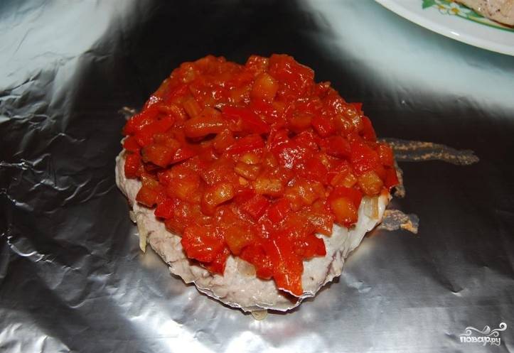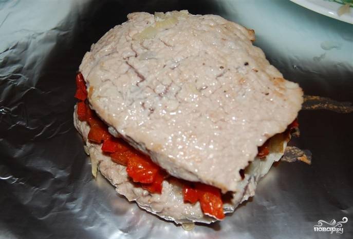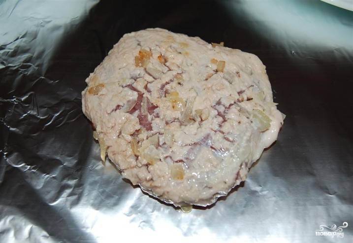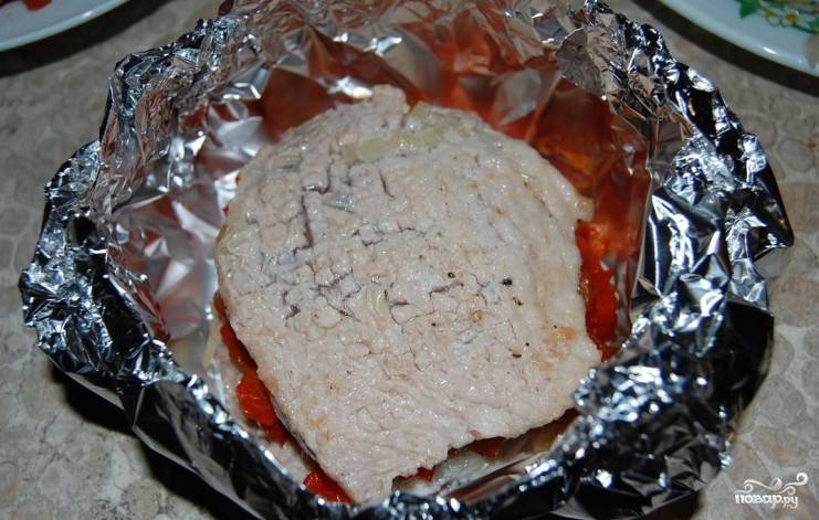 Берем лист фольги такой, чтобы в его можно было полностью завернуть мясо, в его середину помещаем кусочек свинины.