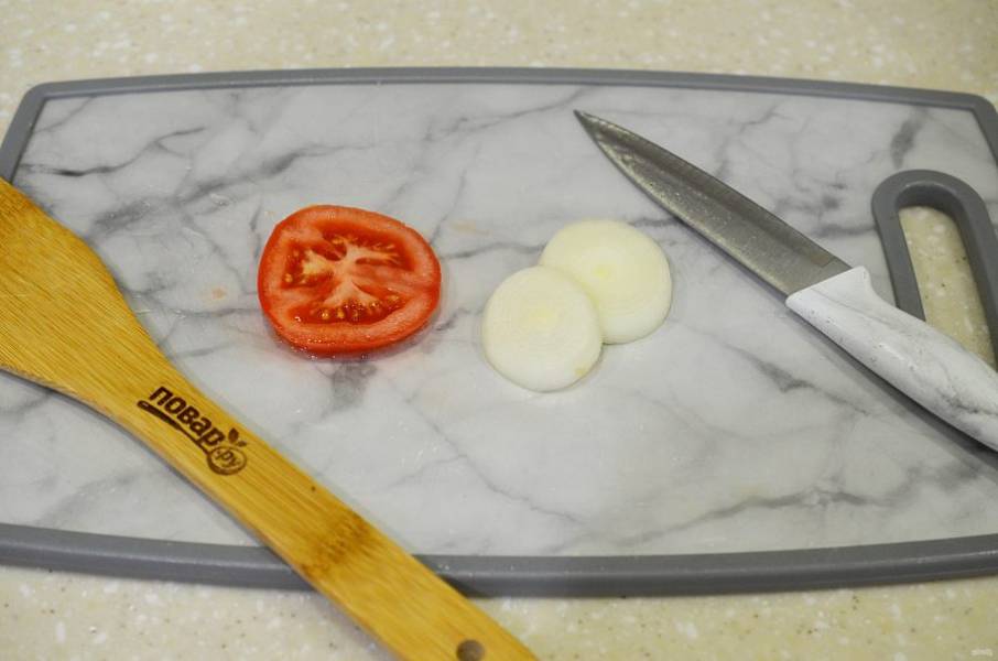2. Лук нарежьте крупными кольцами, помидор кружками.