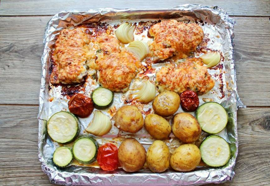 Чтобы не тратить много времени и посуды, предлагаю приготовить мясное блюдо и гарнир на одном противне. Мясо получается нежным с вкусными овощами. Берите рецепт на вооружение!