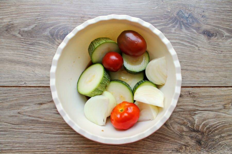 Кабачки порежьте кольцами или дольками, репчатый лук почистите и разрежьте вдоль на куски. Выложите все овощи в миску, полейте растительным маслом и перемешайте.