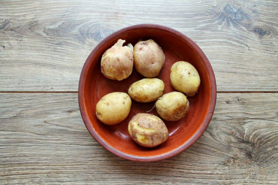 Молодую картошку тщательно вымойте мягкой щеткой и отварите в соленой воде почти до готовности, слейте воду.