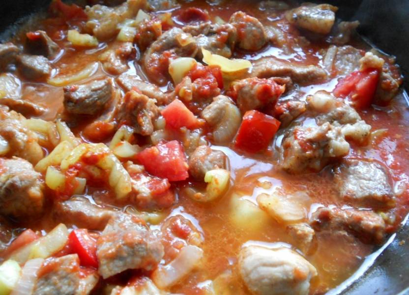 4. Добавляем томатную пасту, болгарский перец и полстакана воды. После этого накрываем крышкой и тушим до готовности.