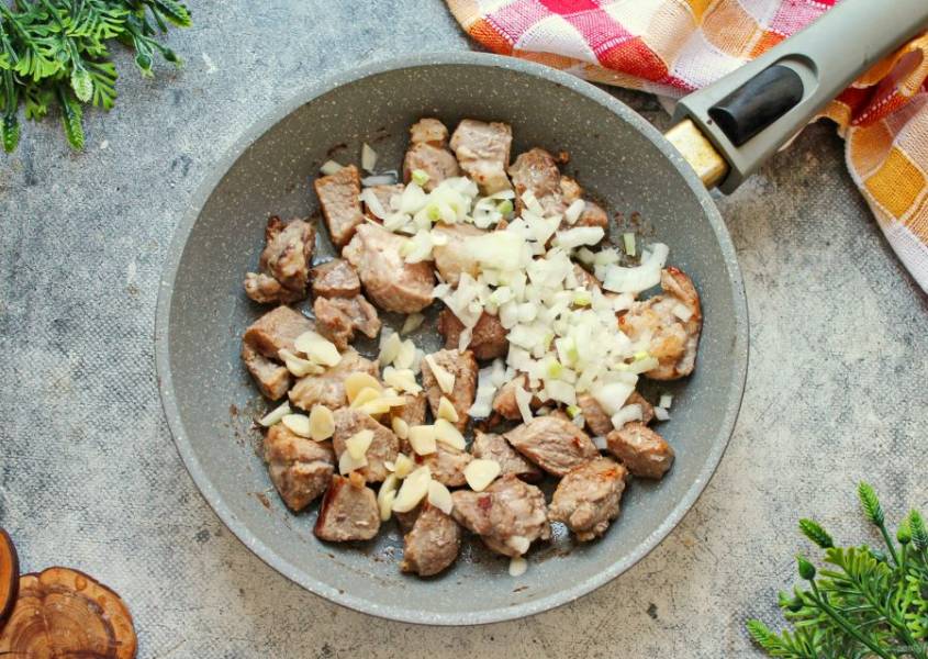 Репчатый лук порежьте по своему вкусу, чеснок порежьте пластинками. Выложите овощи в сковороду и обжаривайте на среднем огне в течение 4 минут, перемешивая.