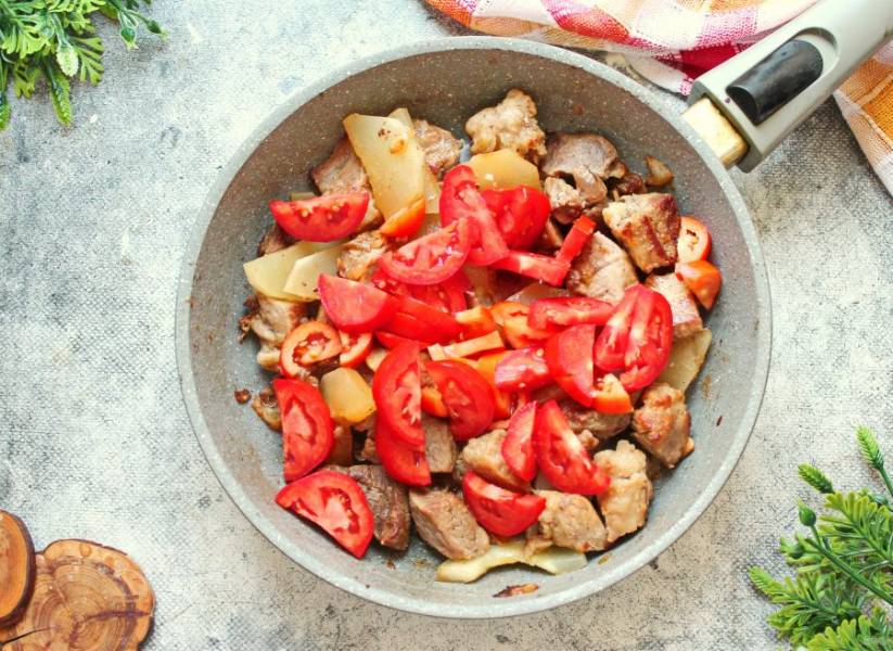 У болгарского перца отрежьте плодоножку, удалите семена и порежьте соломкой. Помидоры разрежьте дольками. Добавьте овощи в сковороду, влейте воду и тушите на медленном огне под крышкой, не перемешивая, 25 минут. Готовое блюдо снимите с огня, разложите по тарелкам и сразу подавайте на стол.