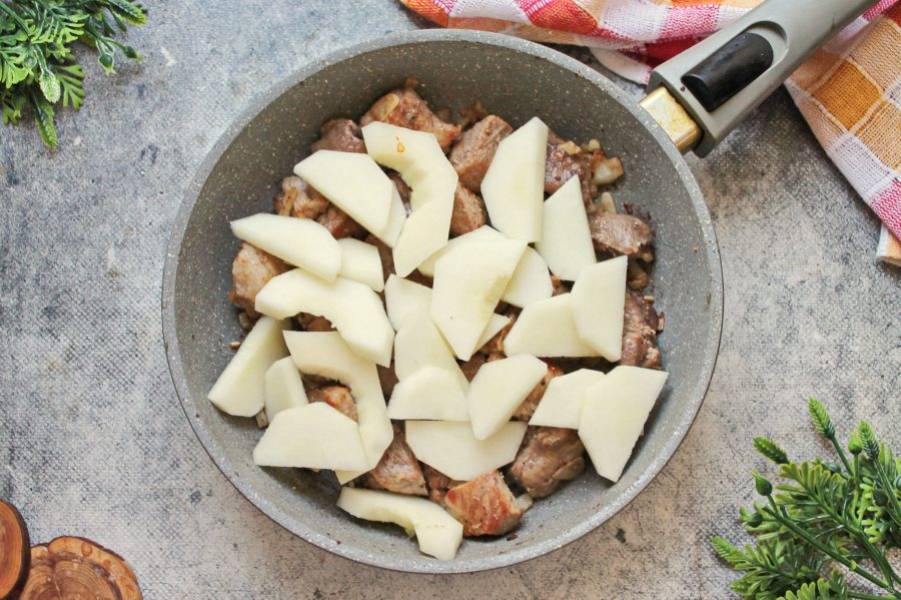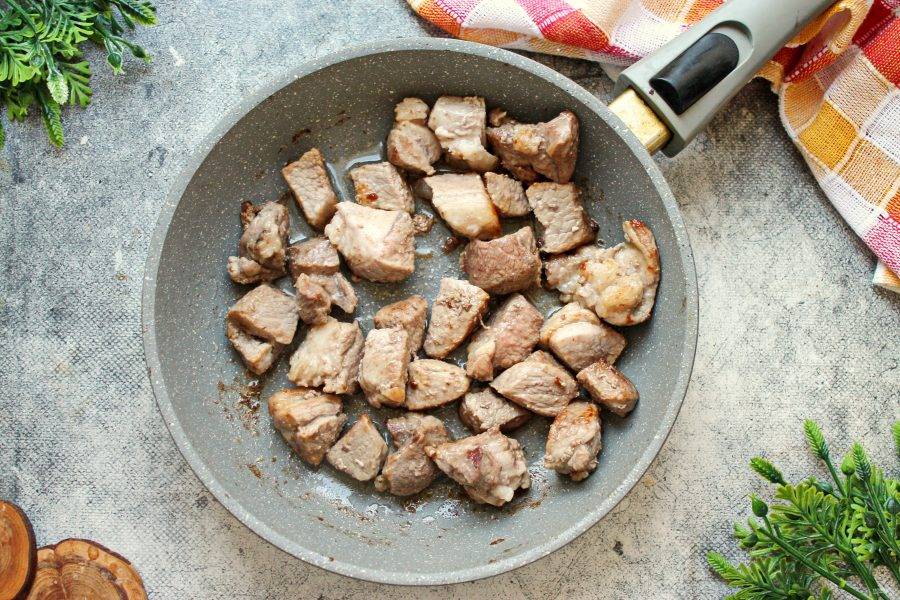 Свинину вымойте, обсушите бумажным полотенцем и порежьте средними кусками. В сковороду налейте растительное масло и разогрейте на сильном огне. Выложите в сковороду мясо и обжарьте до золотистой корочки со всех сторон, примерно 5 минут.