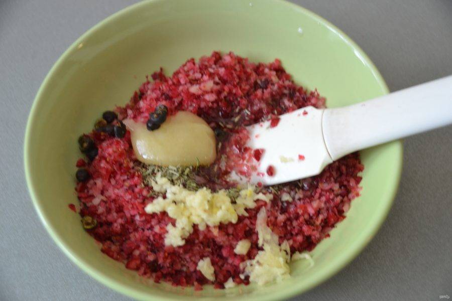 Добавьте ягоды можжевельника в маринад, выдавите туда же чеснок.
