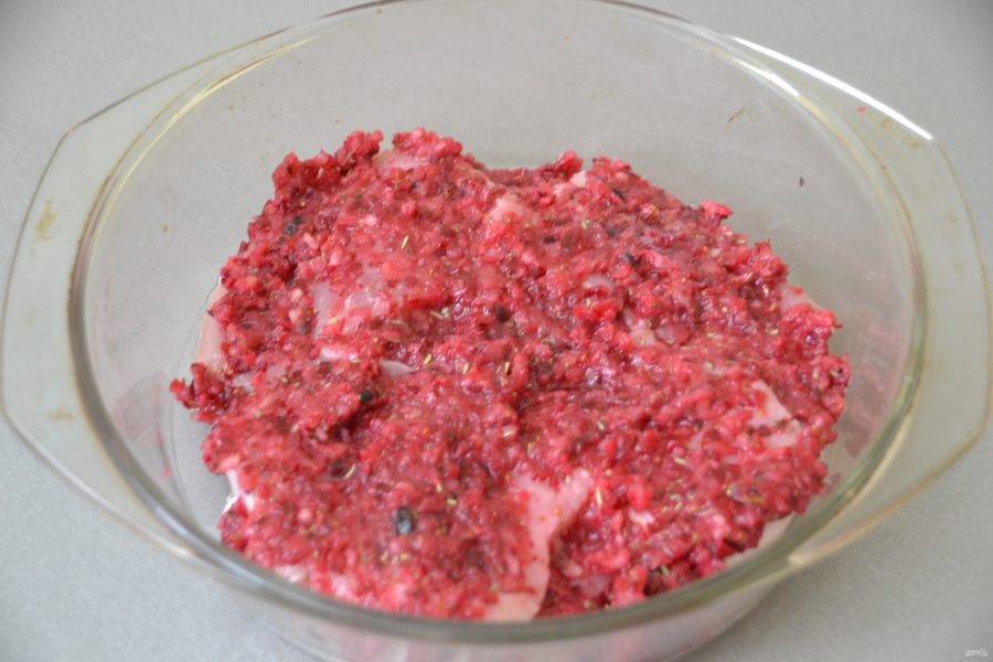 Замаринуйте кусочки свинины в клюквенном маринаде и оставьте примерно на 1 час.