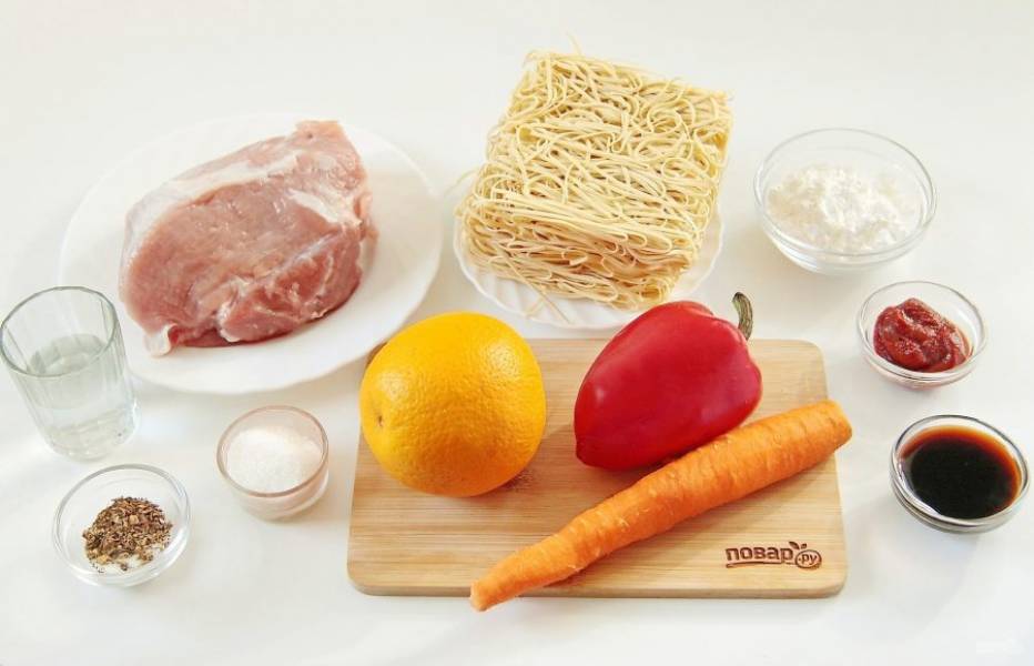 Рецепт приготовления свинины с лапшой и овощами в кисло-сладком апельсиновым соусе. Получается сытно, аппетитно и очень вкусно! Попробуйте!
