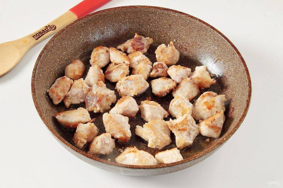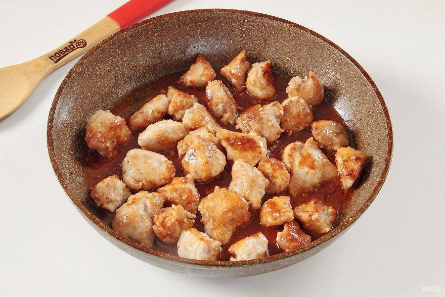 7. Обжарьте мясо на сильном огне, периодически помешивая, до появления румяной корочки.