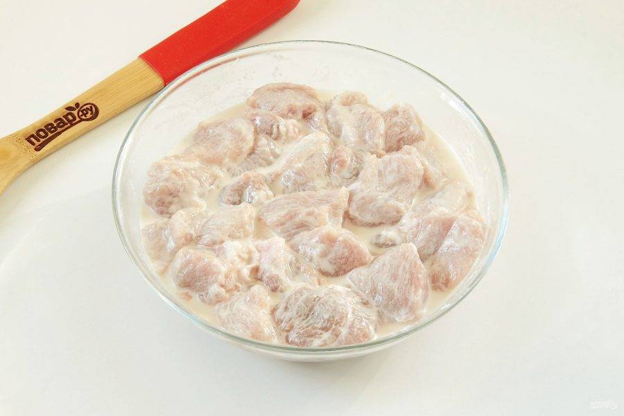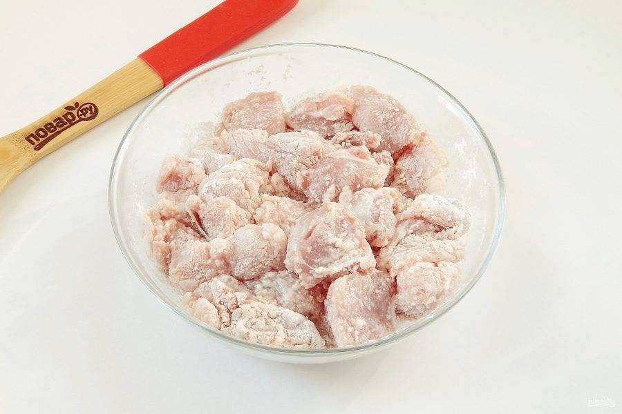 2. Свинину нарежьте кусочками и обваляйте в крахмале.