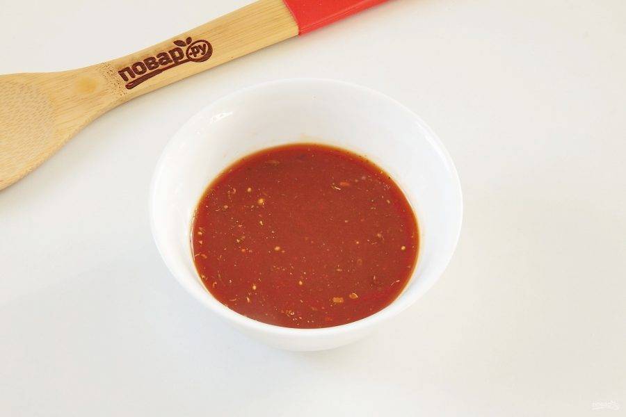 6. Приготовьте соус. Для этого смешайте апельсиновый сок, соевый соус, сахар, томатную пасту и специи.