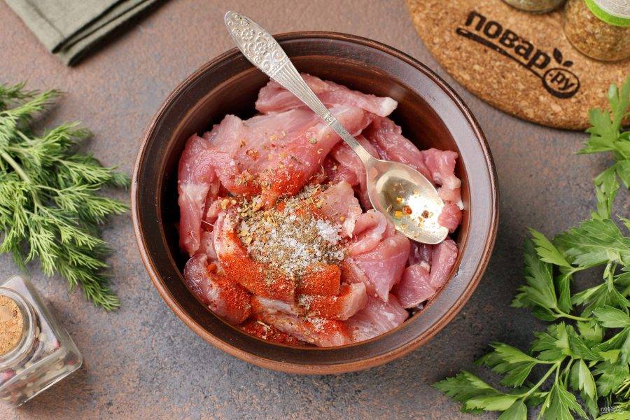 Подготовьте все ингредиенты. Свинину нарежьте соломкой или небольшими кусочками.